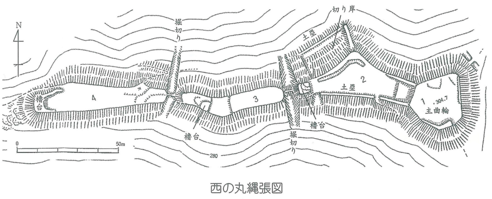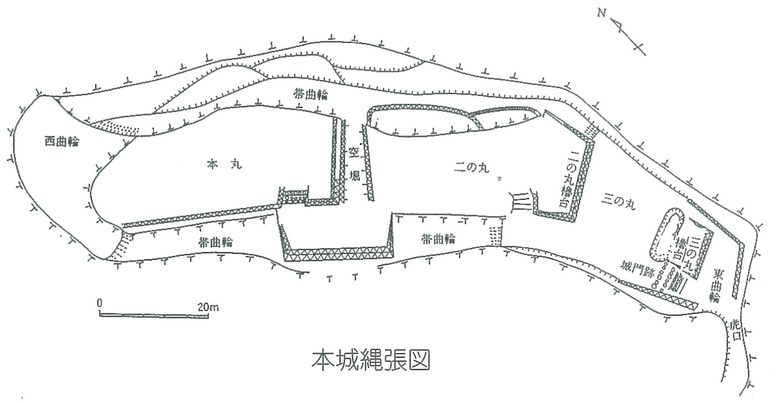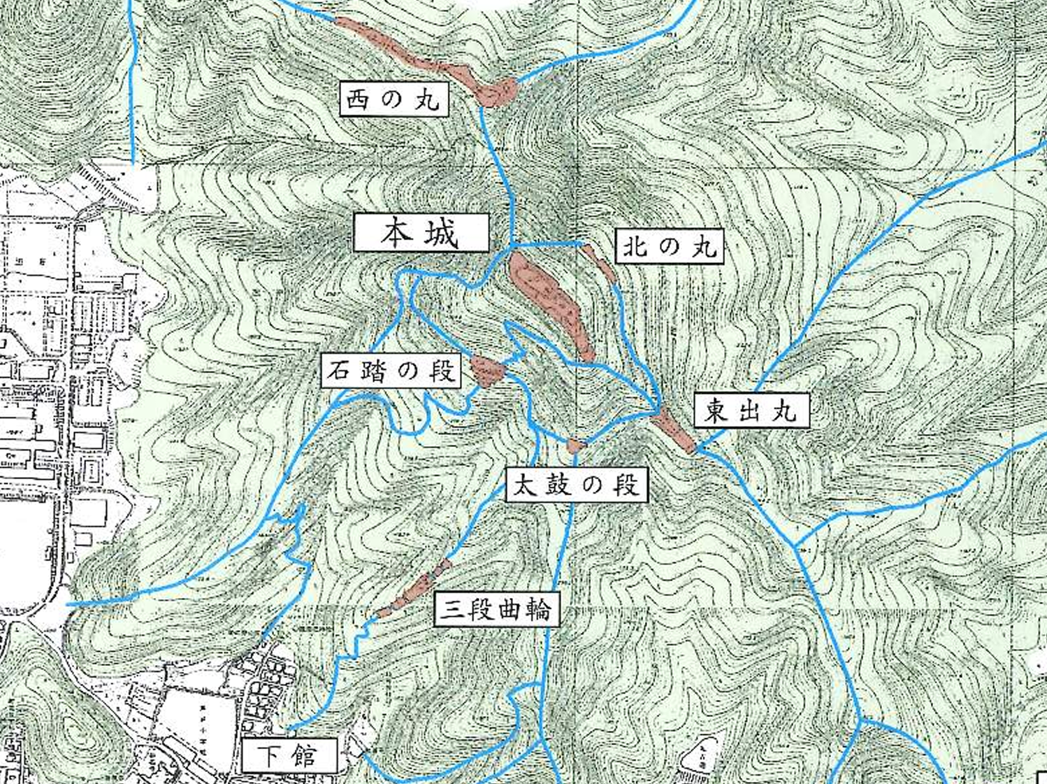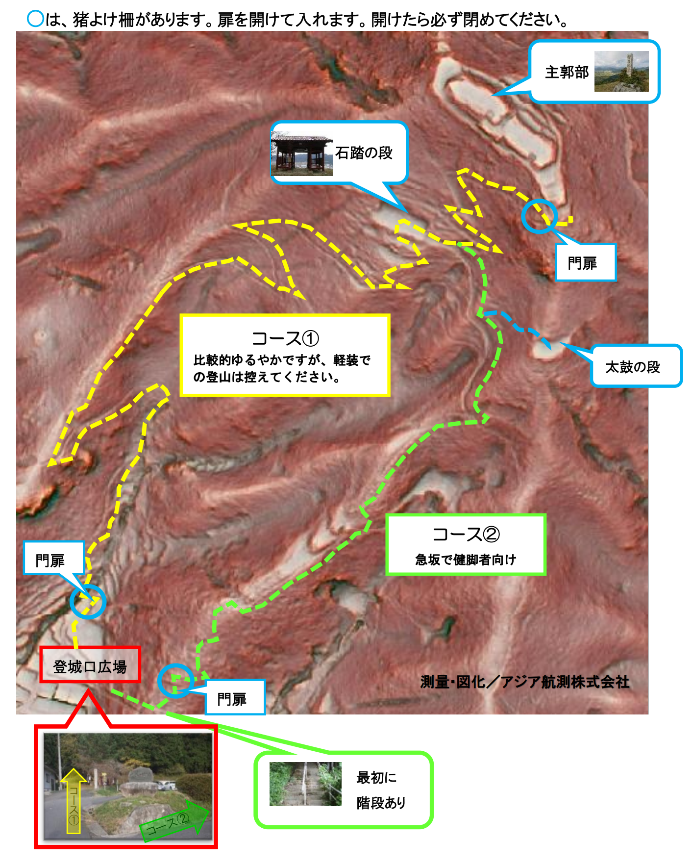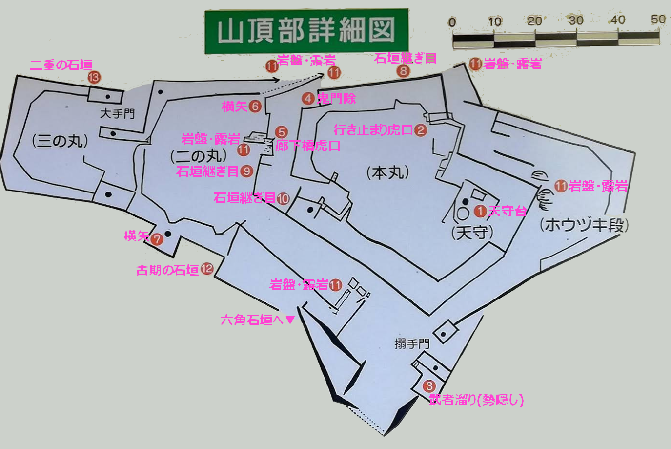本丸→月見櫓跡→車井戸→天守跡→出丸→二ノ丸→三ノ丸→東坂→東坂の上城門→十神砦跡