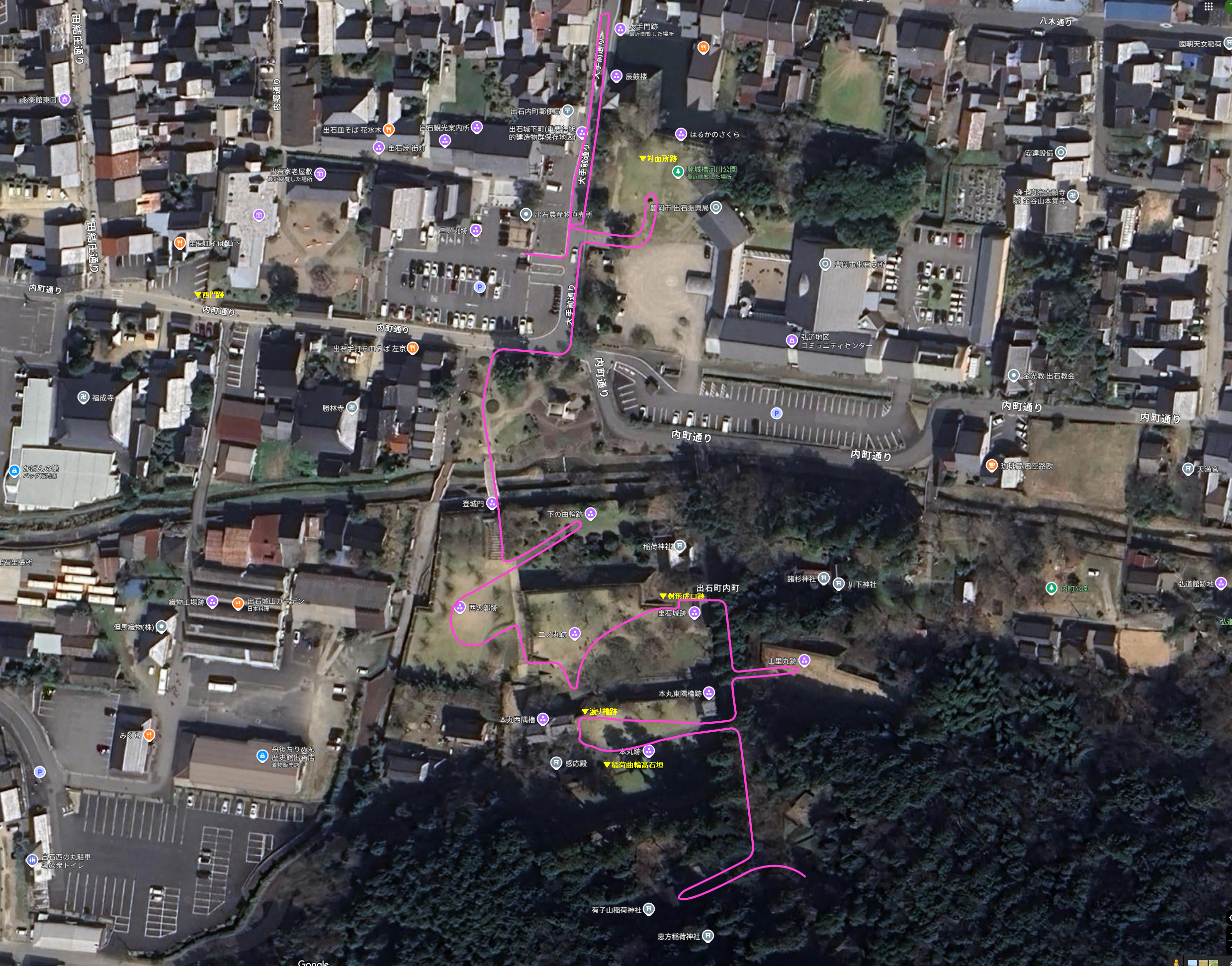 大手門跡→辰鼓楼→対面所跡→登城門→下の曲輪→西の曲輪→二の丸→渡り櫓跡→桝形虎口跡→お城坂→山里丸→本丸→本丸東隅櫓→本丸西隅櫓→感応殿→稲荷曲輪高石垣→稲荷曲輪(有子山稲荷神社)